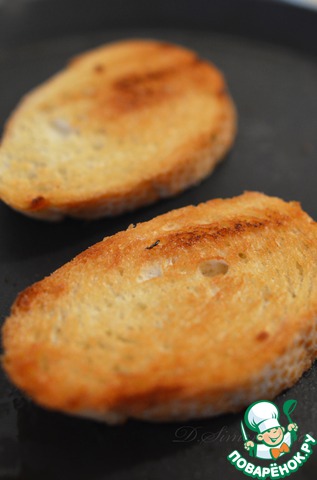Багет нарезать и обжарить с двух сторон до румяного цвета. У нас получились такие вкусные хрустящие кростини, очень популярные в Италии.