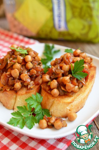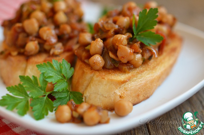Осталось дело за малым. На кростини выкладываем томатный нут и с большим удовольствием и аппетитом приступаем к еде.