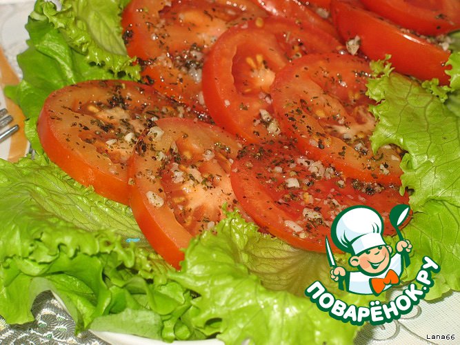 Ну а теперь выкладываем наши ароматные, медово-чесночные помидорные кольца в виде eлочной мишуры на блюдо, устланное листьями зеленого салата (на еловую ветку