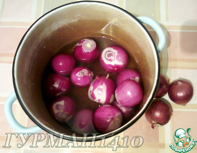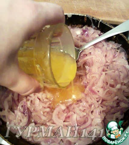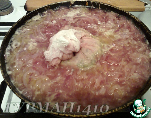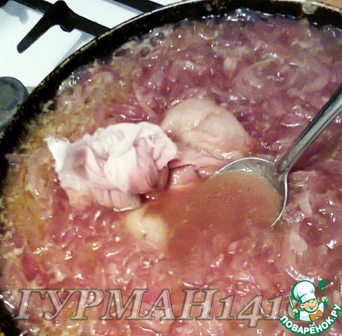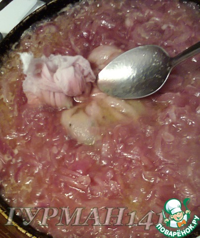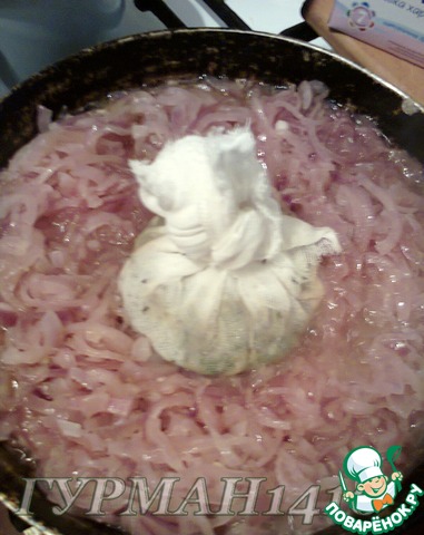 Периодически нажимаю ложкой на мешочек (букет гарни), чтобы аромат выходил в лук, также его поворачиваю.
