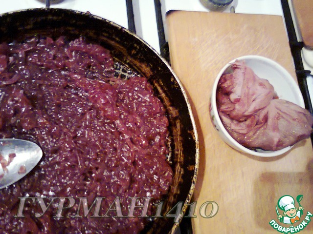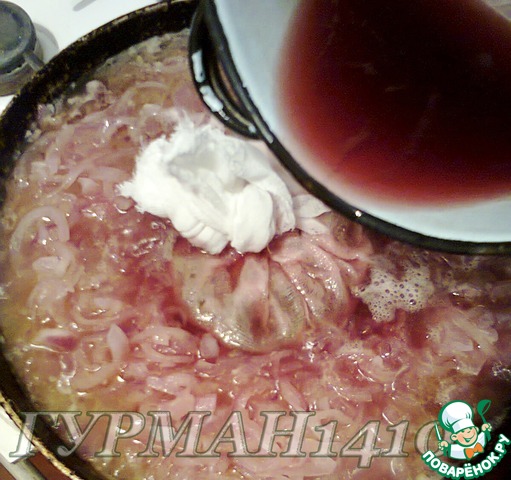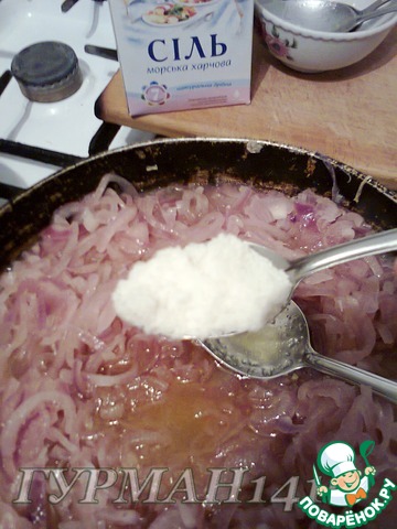 высыпать лук. Лук постоянно мешать. Он должен стать прозрачным и мягким, пускает много сока. Внимание! Ни в коем случае его не зажаривать!