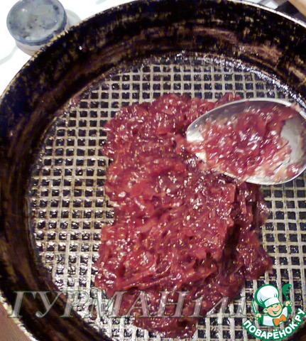 Тушим с открытой крышкой на медленном огне 2-3 часа, постоянно помешивая, пока лук превратится в мармелад. Испаряется вся влага, лук хорошо отделяется от сковороды. Вытаскиваем наш мешочек с гарни.