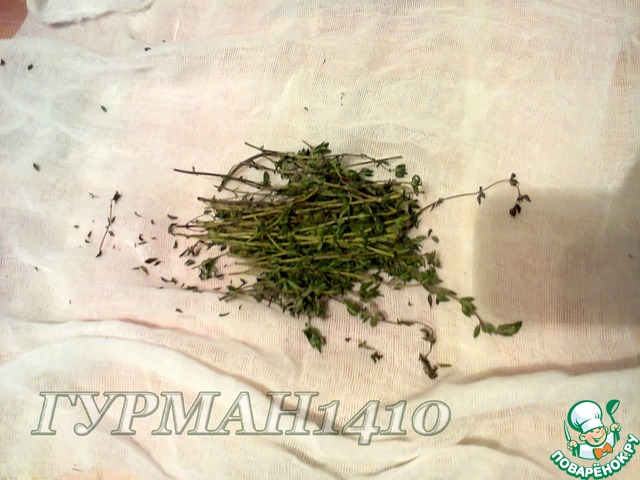 У меня размер свернутой марли 25х25см. На марлю выкладываем «на глаз» душистые травы (свежие или сухие) и специи. Сегодня у меня: