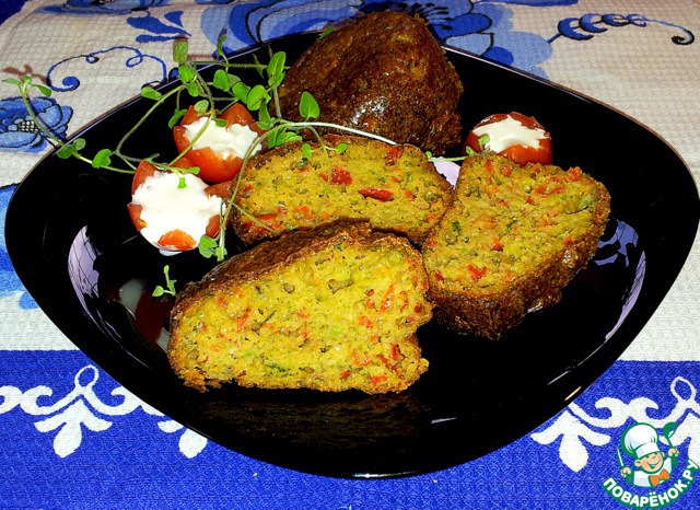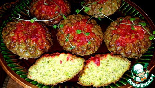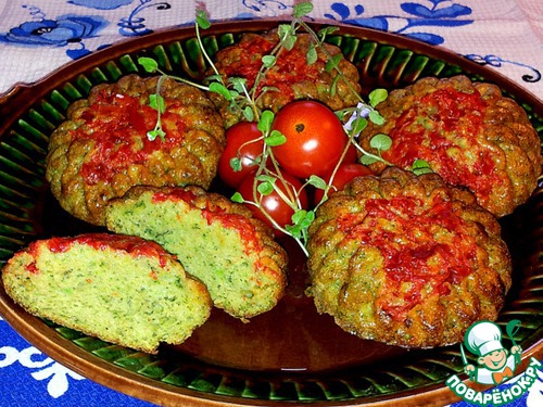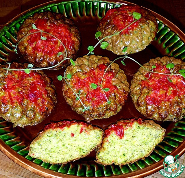 Завтрак похож на кексики. Очень мягкие, как губка. В разрезе видна зелень петрушки и укропа.