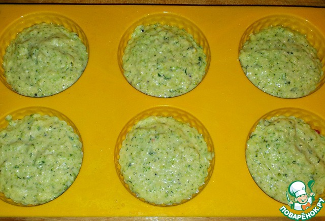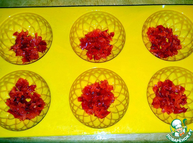 Ячейки формы смазать маслом. На дно каждой ячейки положить измельчённый перец, который придаст красивый вид и поднимет настроение!