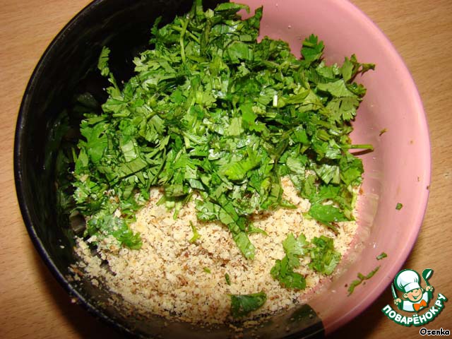 Мелко нарезать кинзу, добавить к орехам и чесноку.