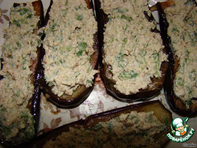 Баклажаны нарезать лодочками и обжарить. Я разрезаю баклажан вдоль на три части.