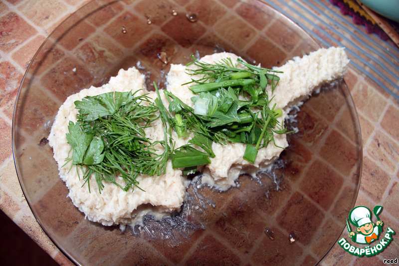 Для начинки мелко режем зелень и выкладываем ее на первый слой.