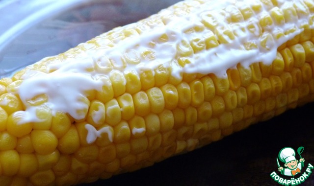 Кукурузу обмазываем майонезом. Можно обмазать сметаной, будет более нежный вкус. Если любите остренькое, по вкусу обсыпать чили.