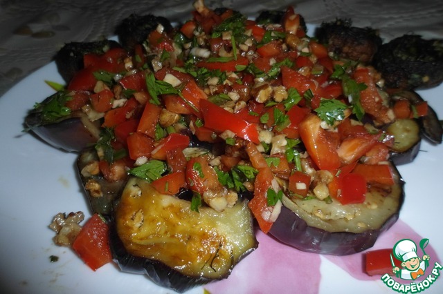 6. У меня в холодильнике оставались фаршированные шампиньоны и я присоединил их к баклажанам. Такой рецепт закуски из баклажанов станет хорошим компаньоном для блюд из картофеля.