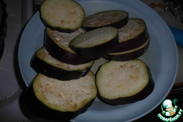 1. Баклажаны предварительно нарезаем кольцами, посолим и даем постоять минут 20, чтобы сошла горечь. Промоем и обсушим полотенцем.