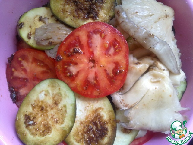 Овощи нарезаем крупными кольцами. После чего приготовленным соусом полить овощи и грибы. Всё хорошо перемешать.