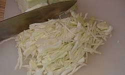 1) 2 килограмма капусты нарезать как на щи. Уложить в большой таз для перемешивания.