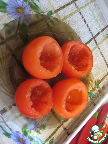У помидоров срезаем верхушку и аккуратно вынимаем мякоть (она нам не понадобиться).