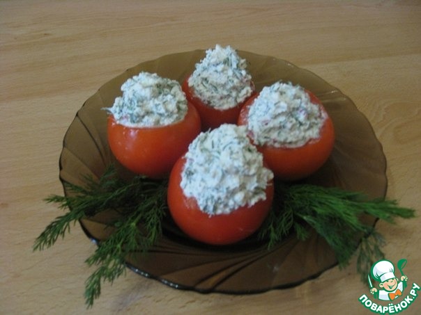 Наполняем чашечки помидоров творожной начинкой и украшаем веточками укропа.