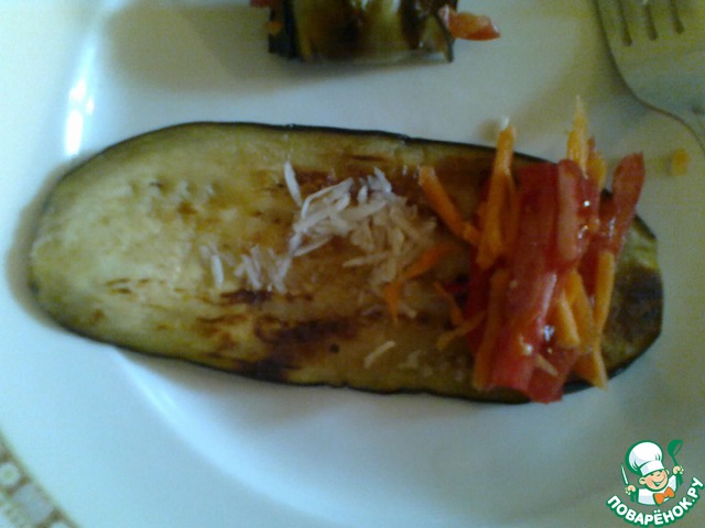 Когда все нарезано и натерто, поджариваем баклажаны с обеих сторон до румяной корочки, "мажем" чесноком и на край кладем полосочки помидоров и морковку. Беремся за край и скручиваем в рулетик, чтобы вся начинка оказалась посередине рулета (на мое удивление все очень просто делается и рулетики не разваливаются, их нужно просто класть швом вниз). Благодаря помидорам рулеты получаются очень сочными и не приторными. Также сырая морковь и помидоры нивелируют подсолнечное масло, которое баклажанчики очень даже много впитывают)).