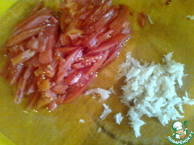 Полосочками нарезать помидоры и измельчить чеснок (на терке или в чесночнице)