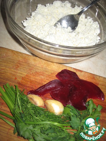Для начинки возьмем творог, зелень, чеснок и несколько кусочков свеклы (в оригинальном рецепте предлагают в начинку и салат добавлять ботву, но сейчас зима, и ботву достать я не сумела).