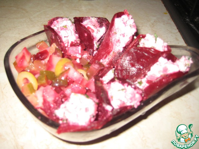 После того, как свекла полностью сварится, остудить, почистить и нарезать очень-очень тонкими кружками (если нарезать толстыми, они не будут держаться). Часть кусочков (не кондицию) отложить для начинки и салата.