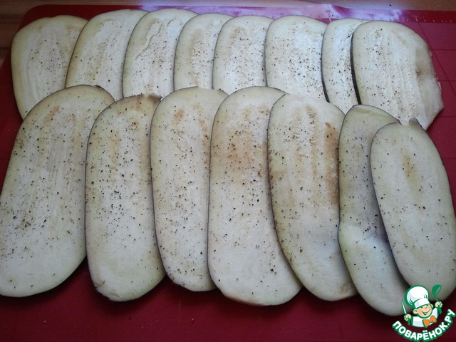 Баклажаны посолить, поперчить и оставить мин. на 10-15. Баклажаны станут мягкими и их легко будет скручивать.
