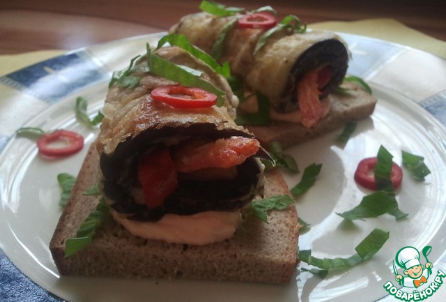 Для этого режим любимый хлебушек на кусочки по величине рулетика. На хлеб выкладываем чайную ложку чилли-соуса, а на соус садим баклажанчик (предварительно вынуть зубочистки). Посыпаем любой зеленью.