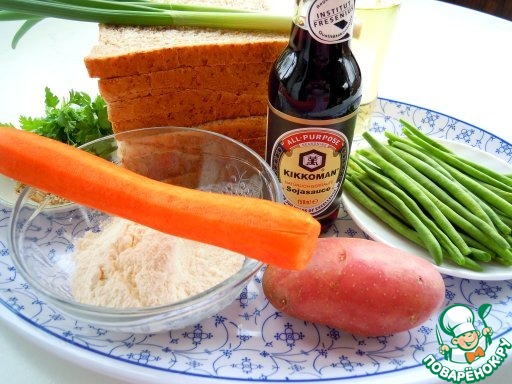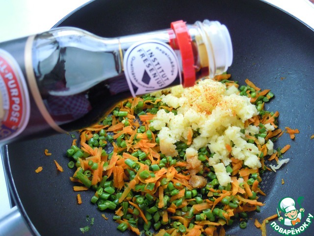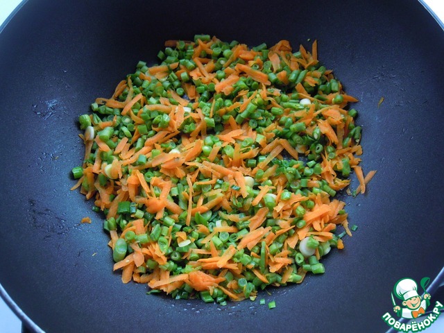 Разогрейте 1 ч. л. растительного масла и обжарьте морковь, фасоль и зеленый лук в течение 4 минут.