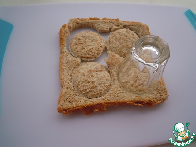 Рюмкой или другой круглой формочкой (примерно 4 см в диаметре) вырежьте из хлеба кружочки.