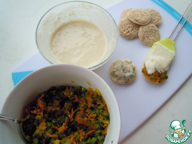 Обмажьте тестом каждый кружок со стороны овощей, не забывайте края, там где овощи соединяются с хлебом. Я это делала силиконовой кисточкой.