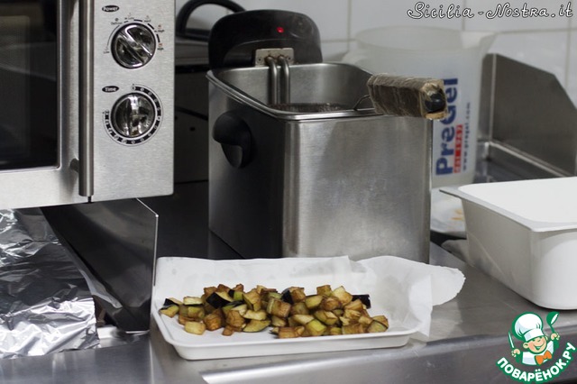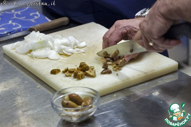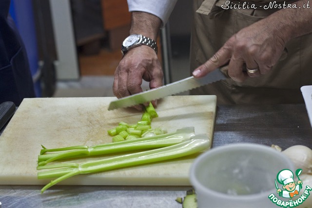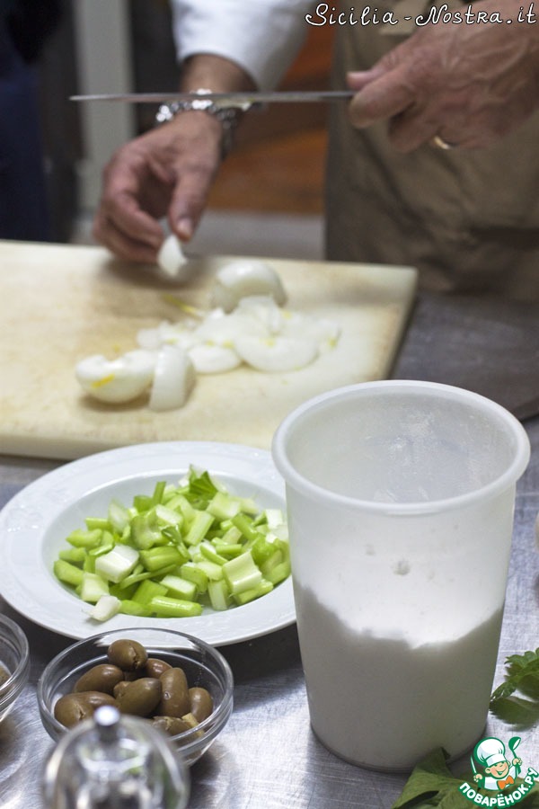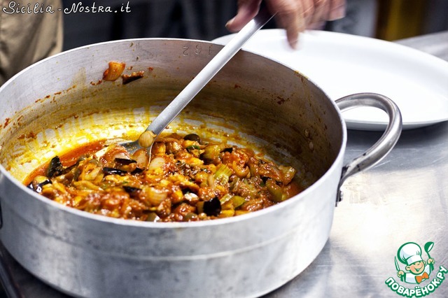 Потомить лук на медленном огне пару минут, затем добавить все остальные игредиенты: сельдерей, баклажаны, оливки, томатную пасту, каперсы. Хорошо перемешать. Посолить и поперчить по вкусу.