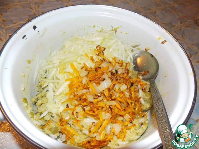 Лук и морковь обжарить.. Добавить к пюре и натереть туда же кабачок.. И измельченный чеснок.
