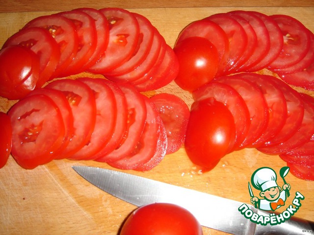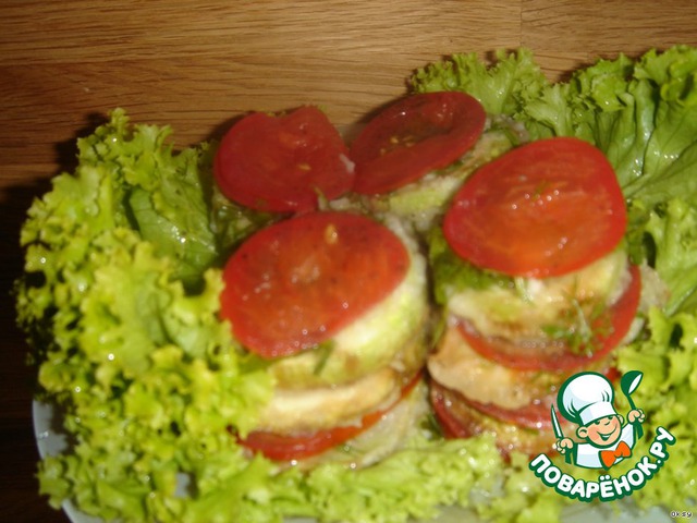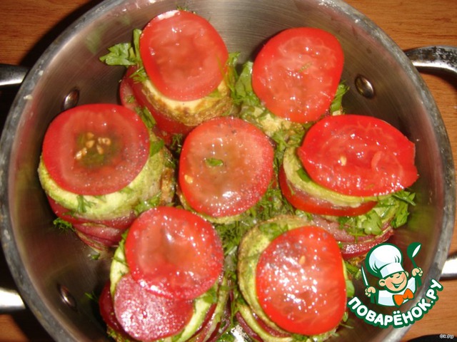 Таким образом выкладываем слоями один на один все кабачки и помидоры. Все это ставим на огонь. Необходимо протомить под крышкой 7-10 минут.