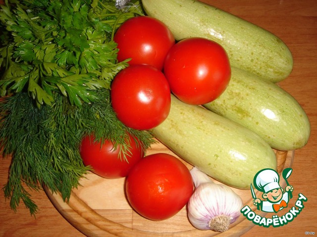 Выкладываем в кастрюльку слоем пластинки кабачков, присыпаем смесью зелени и чеснока, сверху на каждый кружок кабачка кружочек помидора. Солим и перчим по вкусу.