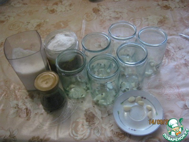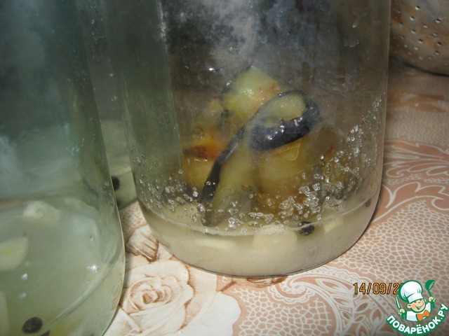 В приготовленные банки раскладываем приправу (на 4 кг баклажанов выход примерно 4 литровые банки). В каждую банку кладем по 4 зубчика чеснока, 6 чайных ложек сахара, 2 чайные ложки соли, 3 столовые ложки уксуса и 5 горошин черного перца