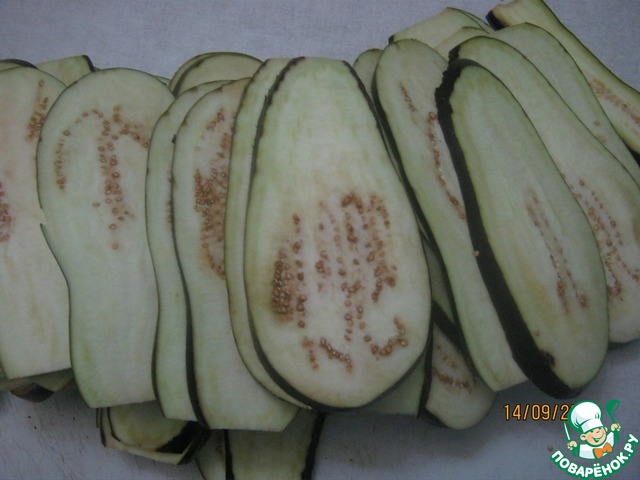 Баклажаны режем вдоль на ломтики толщиной примерно 4-5 мм