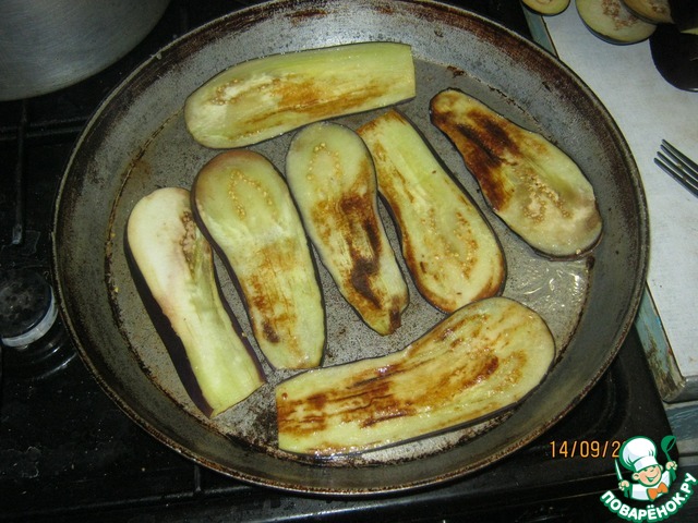 Обжариваем ломтики баклажанов с двух сторон в небольшом количестве масла. Лучше всего использовать чугунную сковороду, масло идет намного меньше и баклажаны не горят.