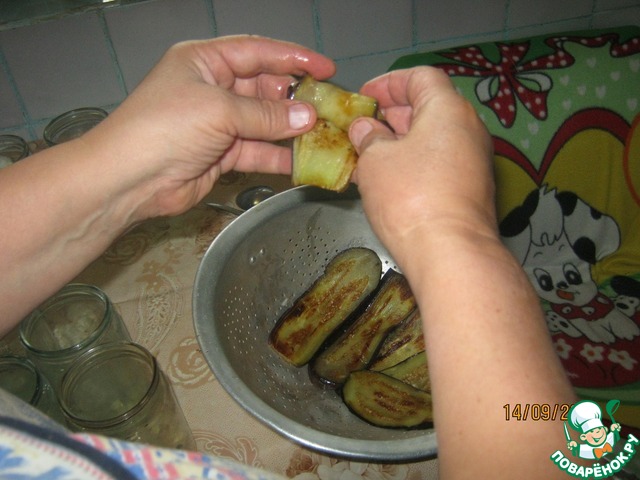 Обжаренные баклажаны складываем на дуршлаг, чтобы стекло лишнее масло. Затем скручиваем их в рулетики.