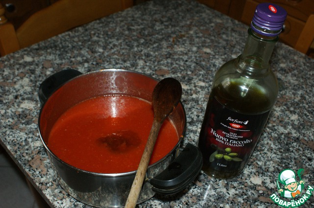 В соус добавляем оливковое масло. Ставим на медлянный огонь, готовим около 30 мин. без крышки, вот тут время приготовления зависит от помидоров. Даем испариться жидкости из соуса, и чем больше, тем лучше.