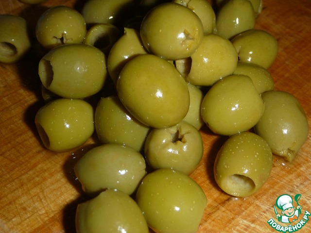 Оливки разрезаем на 2 части.