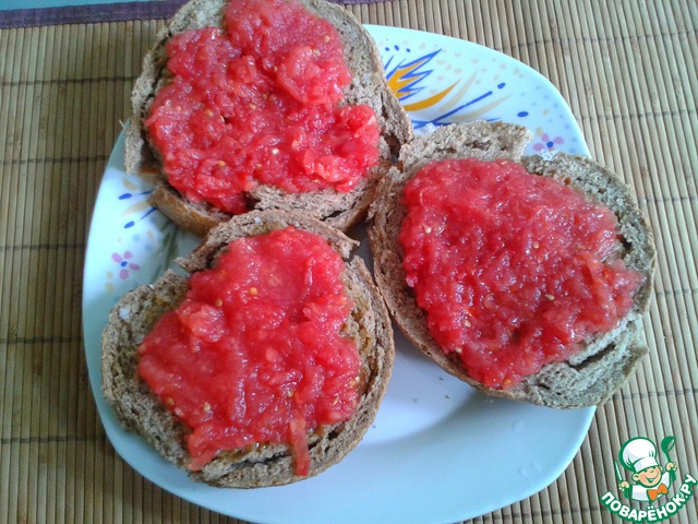 Помидоры натираем на терке или измельчаем в блендере. Кладем сверху, стараясь закрыть всю поверхность.
