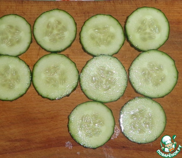 Достаем огурцы. На один кружочек кладем начинку и накрываем другим кружочками.