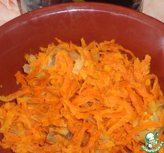Тертую морковь соединить с измельченным репчатым луком. По желанию лук можно порезать крупнее. Заливаем сметаной и тушим до мягкости. Немного остудить.