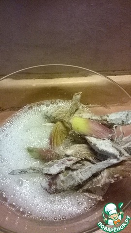 С 4 артишоков снять грубые верхние листья. обрезать колючки на верхушке. Чтоб не потемнели пока вы будиде чистить следующий, опускайте в холодную подкисленую воду.