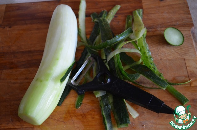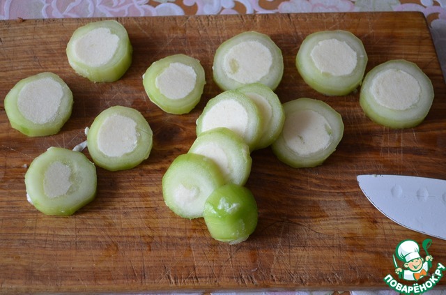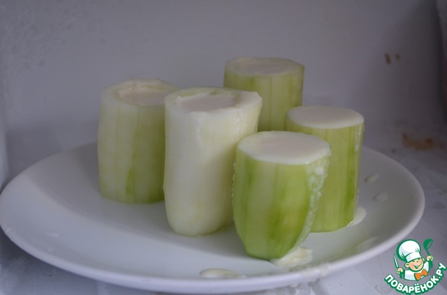 Огурцы очищаем от кожицы. Разрезаем на бочонки, примерно по 10 см.