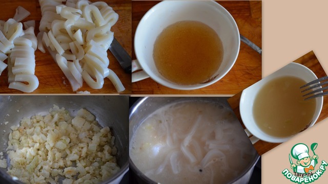 Желатин замачиваем в 2 ст. л. воды. Репчатый лук режем на мелкие кусочки и спассеруем на растительном масле. Когда лук почти готов, добавляем к нему муку и обжариваем минутку его с мукой. Заливаем водой, интенсивно перемешивая, чтобы не было комочков. Солим, кидаем перец горошком и лавровый лист. Когда соус закипит-бросаем в него нарезанные кусочки кальмаров. Доводим дло кипения и варим буквально 3-4 минуты. чтобы кальмары сварились, но не стали жесткими. 2-3 ст. л. бульона перемешиваем с набухшим желатином, до его растворения.