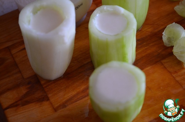 Огуречные стаканчики наполняем суфле из кальмаров. Можно так и оставить до застывания желатина.