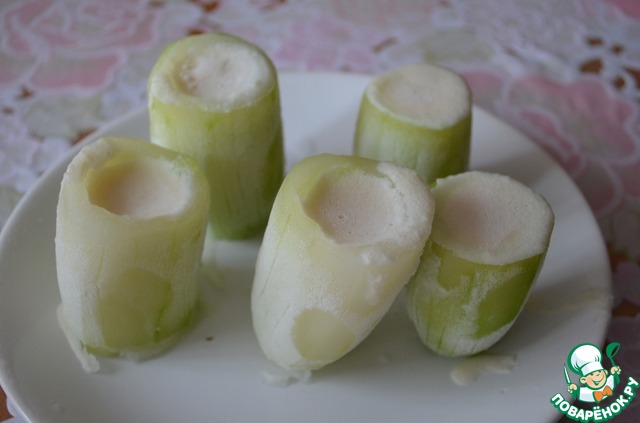 Через пол часа достаем замороженные огурцы и даем им немного оттаять.