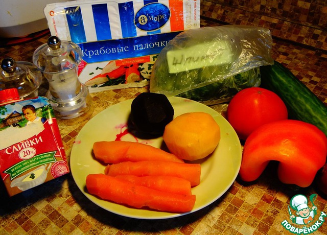 Я отварила ещё и свеклу (она есть на фотографии), но в последний момент передумала её класть, побоялась, что сок потечёт и окрасит всю башенку.