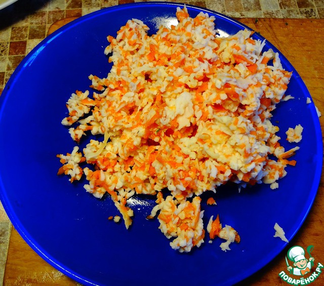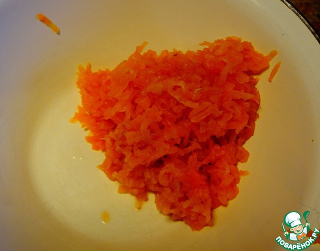 Отваренную морковь нужно почистить и натереть на мелкой тёрке. Посолить и поперчить по вкусу. При желании можно добавить другие любимые вами специи, например, мускатный орех или кориандр.