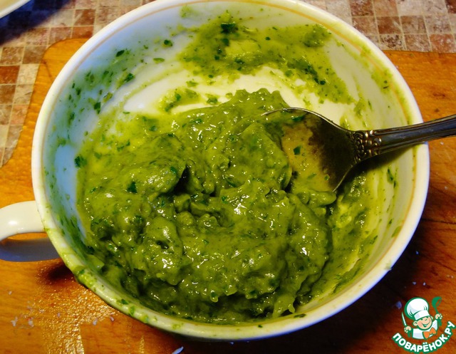 Размять авокадо, добавить зелень петрушки, 1 ст. л. сливок и измельчить ручным блендером. Посолить по вкусу.