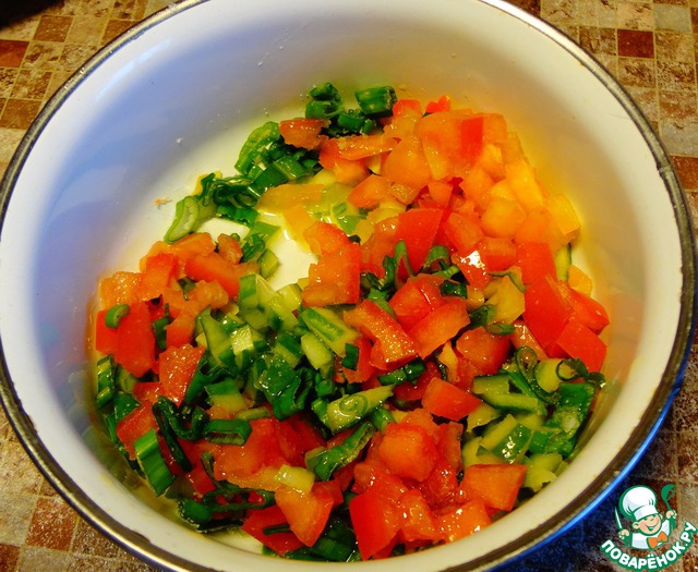 Нарезать зелёную часть огурца кубиками. Помидор освободить от сока и семян. Так же нарезать кубиками. Редис мелко нарезать, зелёный лук тоже измельчить. Всё смешать в миске, посолить и добавить 1ст. л. растительного масла.